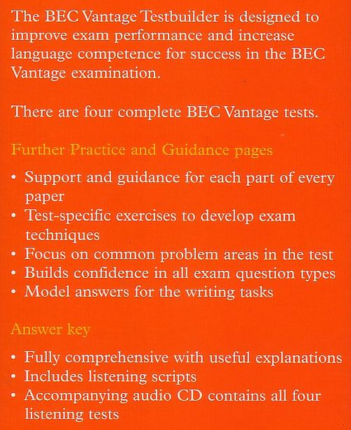 Publikace obsahuje 4 sady cvičných testů stejné obtížnosti a stejného formátu jako zkouška BEC. Navíc jsou doplněny oddíly Further Practice and Guidance, které pomahájí studentovi osvojit si strategie, které použije při zkoušce, aby úkoly plnil správně a v daném časovém limitu. Publikace je nezbytná pro všechny, kteří se chystají ke složení zkoušky BEC. Audio CD s nahrávkami k poslechové části testu je zahrnuto v ceně knihy.